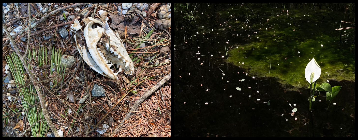 Back in the sun, feet on coarse-grained gravel, I was caught between eras, between worlds. As I slowly strolled alongside a pocket wetland on the way back to the truck, a northern waterthrush beamed its refrain from the shadow-dappled forest. I happened to look over my shoulder and lock onto a wild calla. The white flower blazed against the dark water like Jupiter drifting through the bottomless depths of the cosmos.