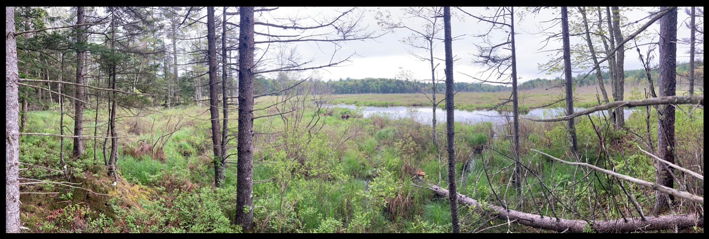 Without specific or otherwise strategic planning, I decided to bushwhack along the edge of the wetland, then cut back to the road. A well-worn hoof path paralleled the backwater. Before long I found fresh deer spoor, and ten minutes later heard an alarm snort from the edge of a beaver dam. As I continued south, I caught movement on the far side of the brook, and quickly raised my binoculars in time to see a buck, his antlers velvet nubs of new growth.
