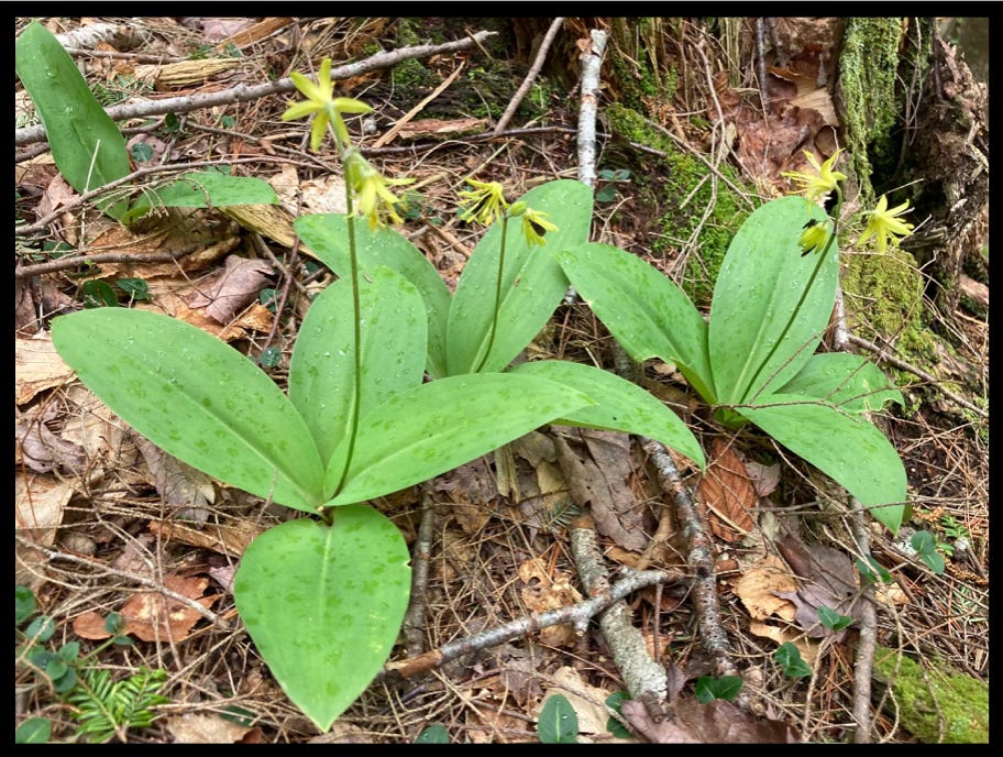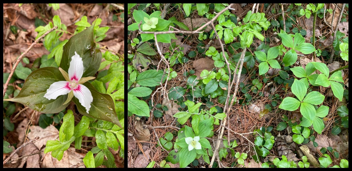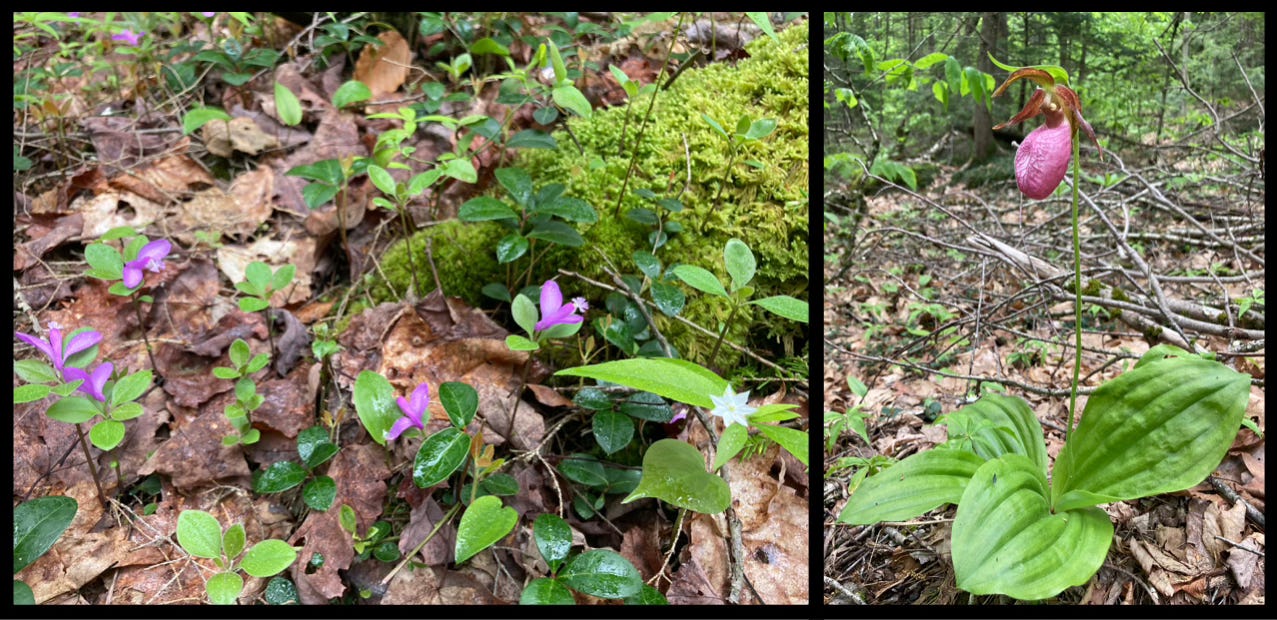 Aside from the hum of the blood-sucking insects and an occasional Logan-bound jet, the woods were blessedly quiet. Midday stretched into early afternoon, and the birdsong became less frequent. Only the gurgle of running water and the muffled footfall of my boots on pine-needled ground echoed in my ears. I stopped to savor the delicate blooms that seemed to grace every square inch along the forest floor.