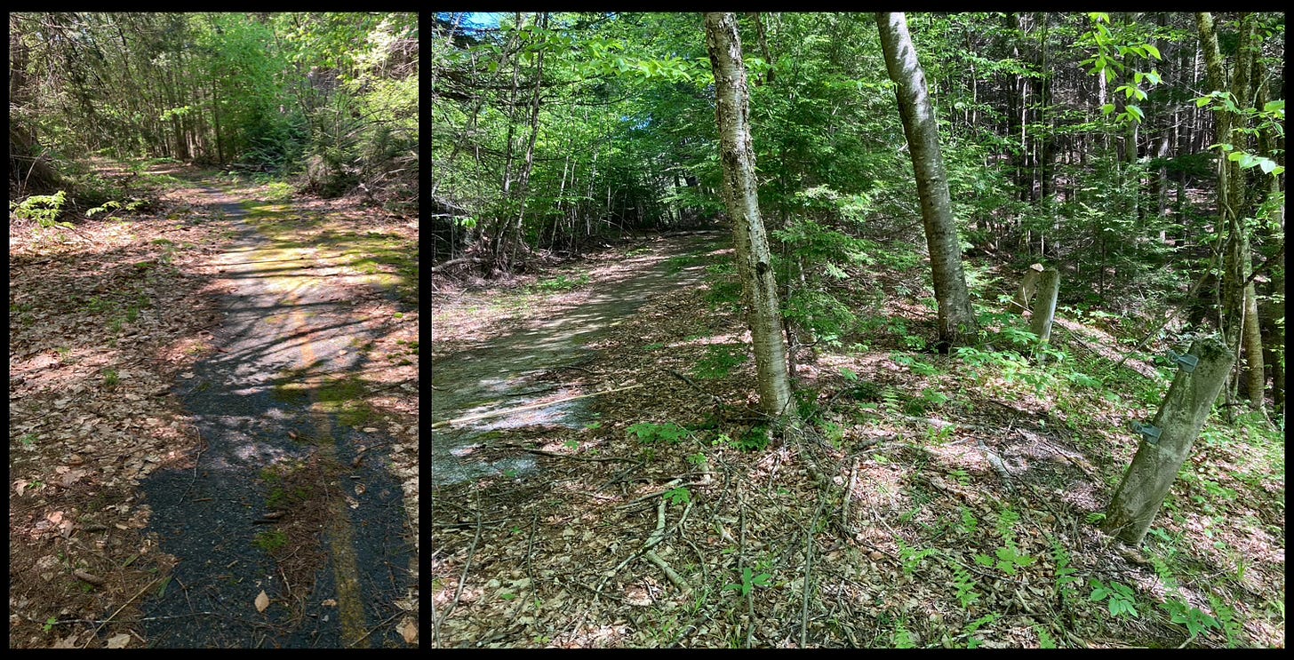 Several hundred yards in, I realized I was walking atop faded macadam, the yellow-painted centerline still visible in patches where wind had blown away the accumulated leaf litter from many previous autumns. A disintegrating section of concrete guardrail posts and braided wire still clung to the edge of a steep embankment, and some of the trees which lined the road had huge trunks.